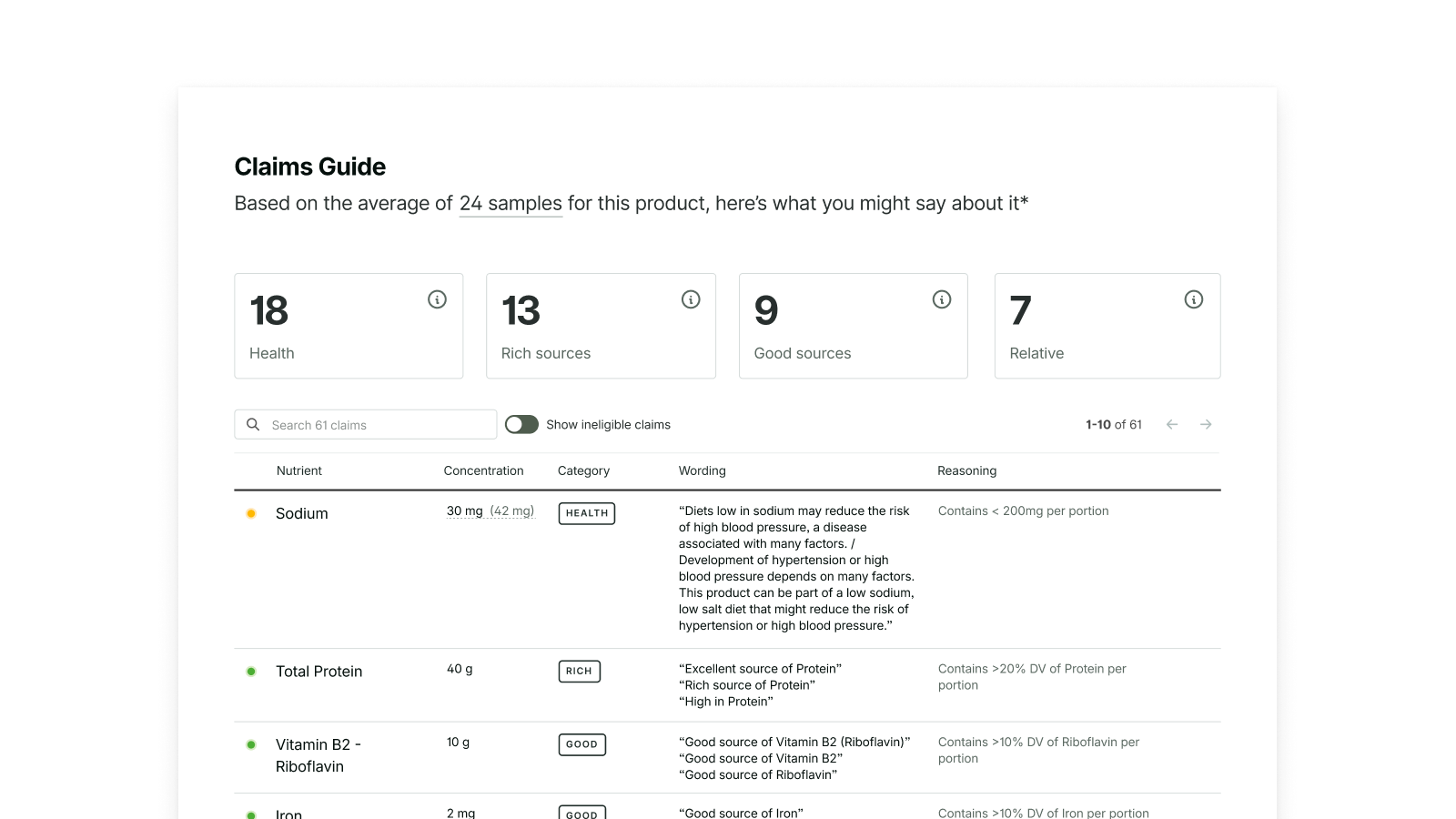All of your results are contextualized with regulatory information, including FDA source claim guidelines and Heavy Metals contaminant context.