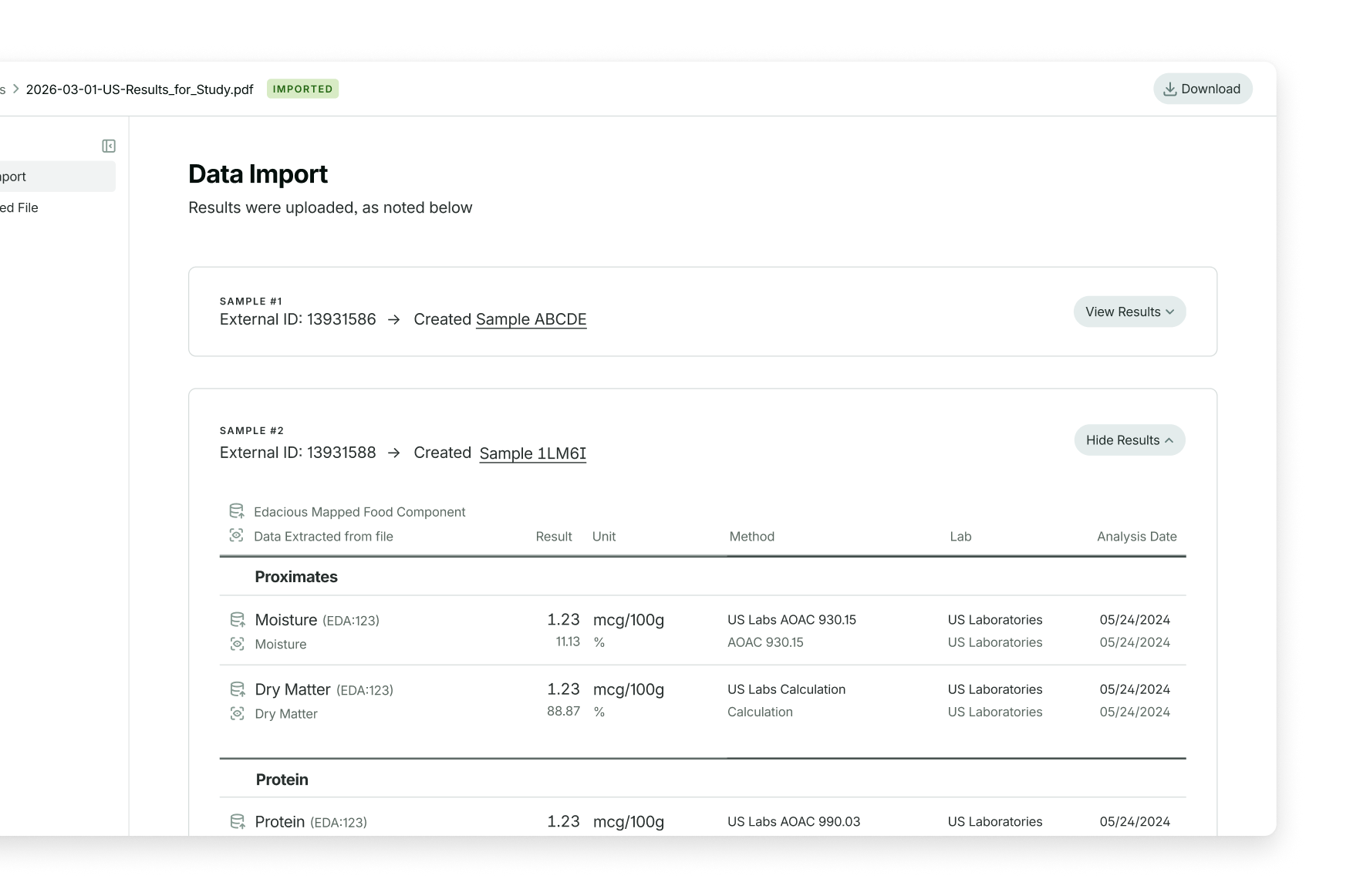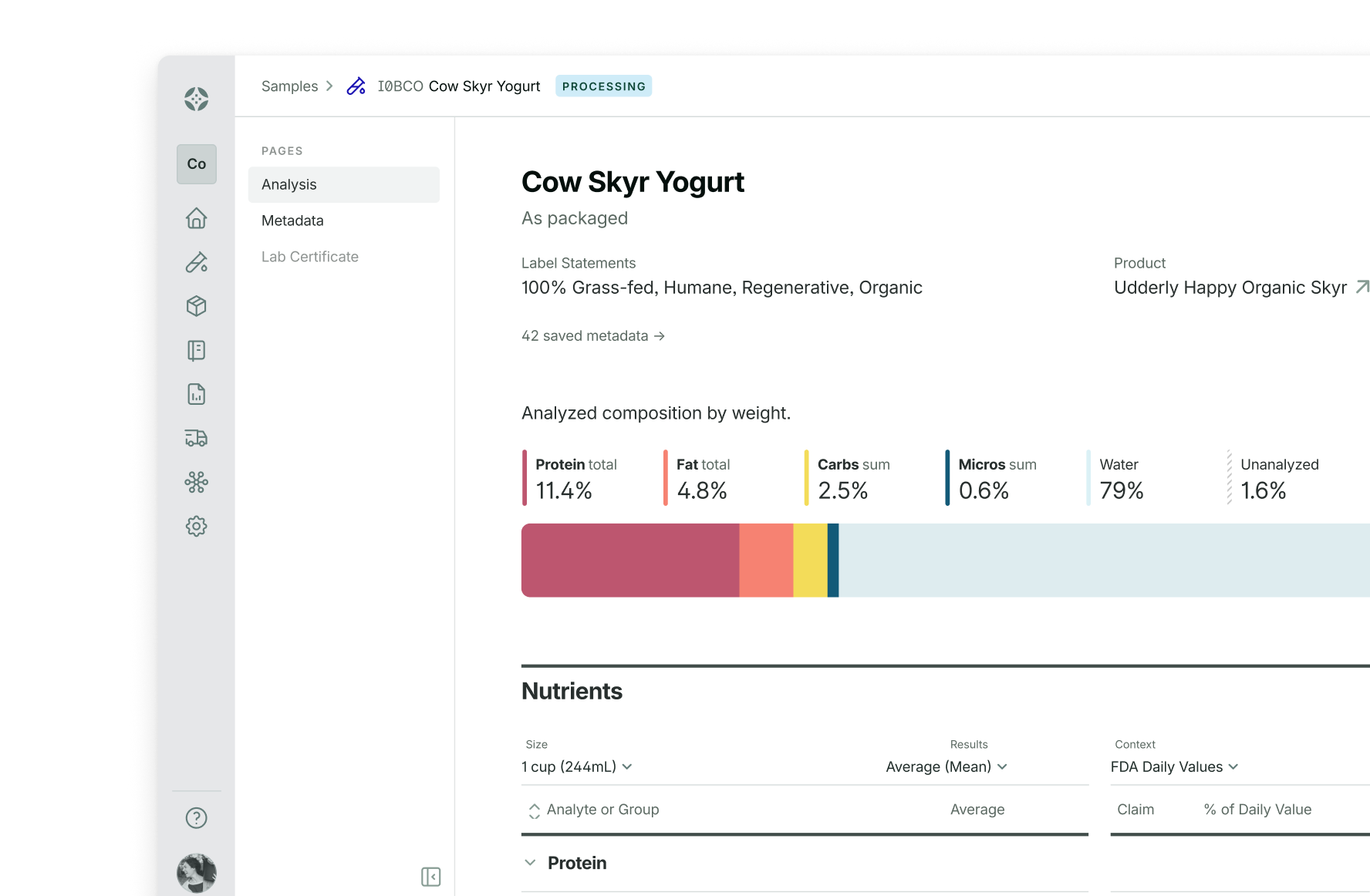 Samples DB is built to make food analysis data easy to understand and compare. Every Edacious Food Lab result is automatically uploaded and converted to your food’s serving size, with context like FDA daily values and regulatory limits included. Advanced+ teams can also upload third-party COAs to centralize all their nutrition data in one place.