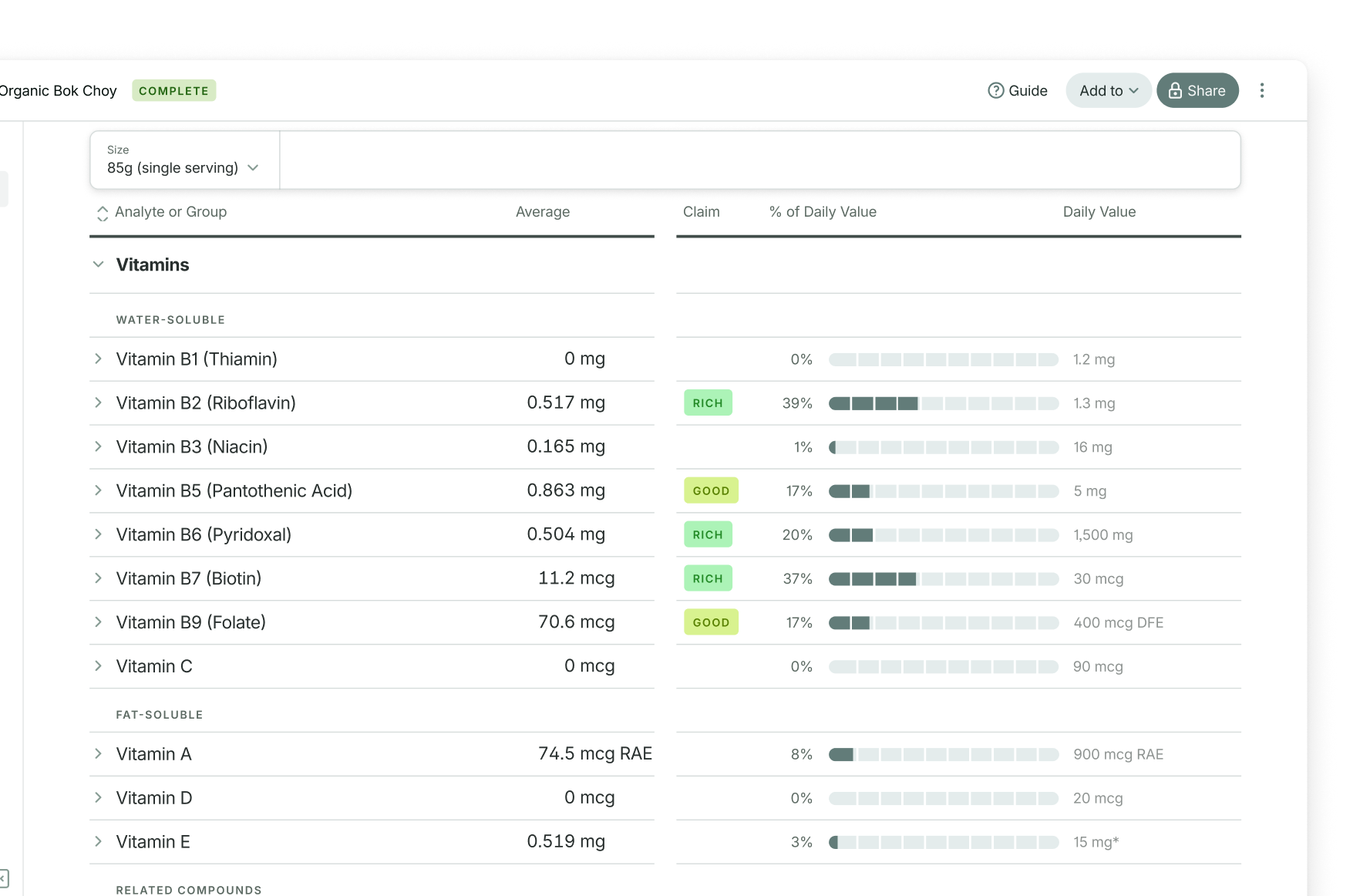 Nutrient results include FDA daily values, to give you immediate context about results quantities in your food, while contaminant results include known regulatory limits, like Prop 65, CDC, and FDA.