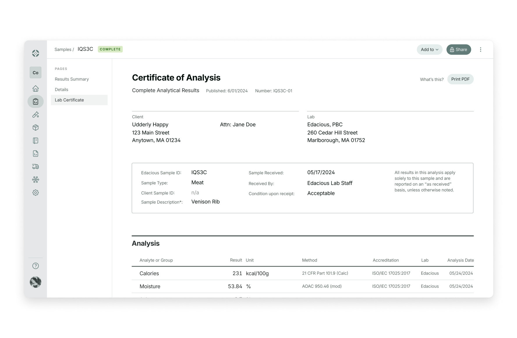 Digital Certificates of Analysis (COAs) are available for all Edacious Labs results automatically.